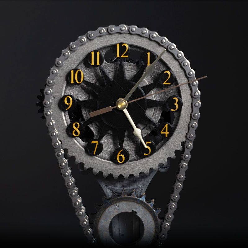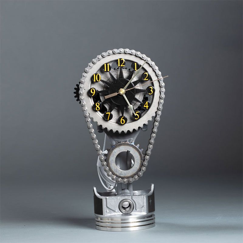 - Diese Uhr besticht durch ein faszinierendes Zusammenspiel von Zahnrädern, Ketten und Kolben; ihr robuster mechanischer Charme macht jeden Schreibtisch, jedes Bücherregal oder jeden Arbeitstisch zu einem optischen Blickfang.